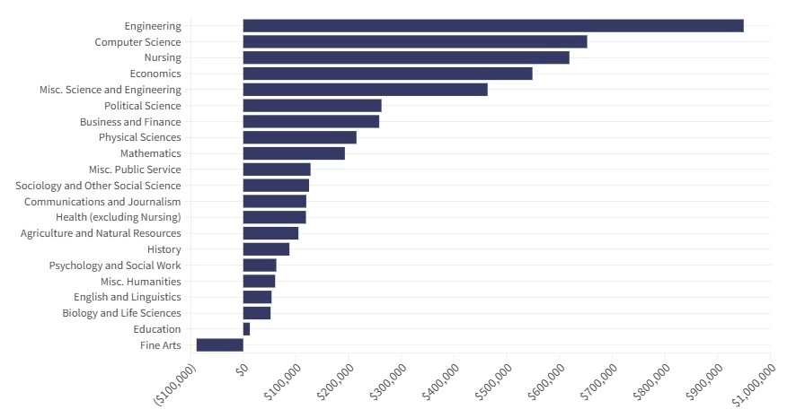While it’s not impossible to calculate the ROI, the simplest method being the median salary, the inefficiency is twofold: that a 18-year-old who calculates the dollar returns on their degree with all the information on its lifetime valuation is the exception, not the rule, and that the value proposition of a job is not sold on a pure monetary returns on the dollars spent.