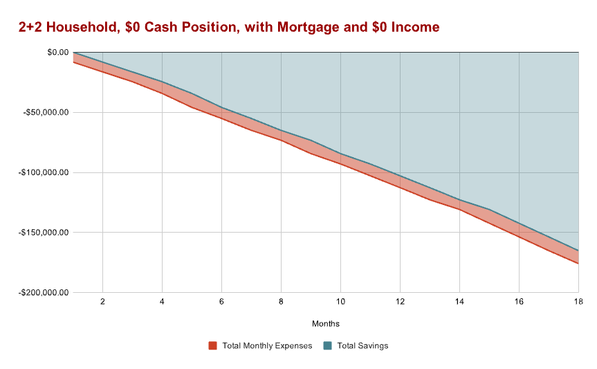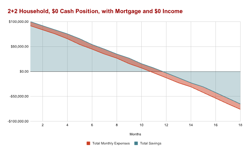 The $100,000 of windfall that served as the down payment was an ex-machina that had to be, as the “realistic” scenario of $0 savings post-purchase makes for a terrible example to illustrate how cash burn rate works.